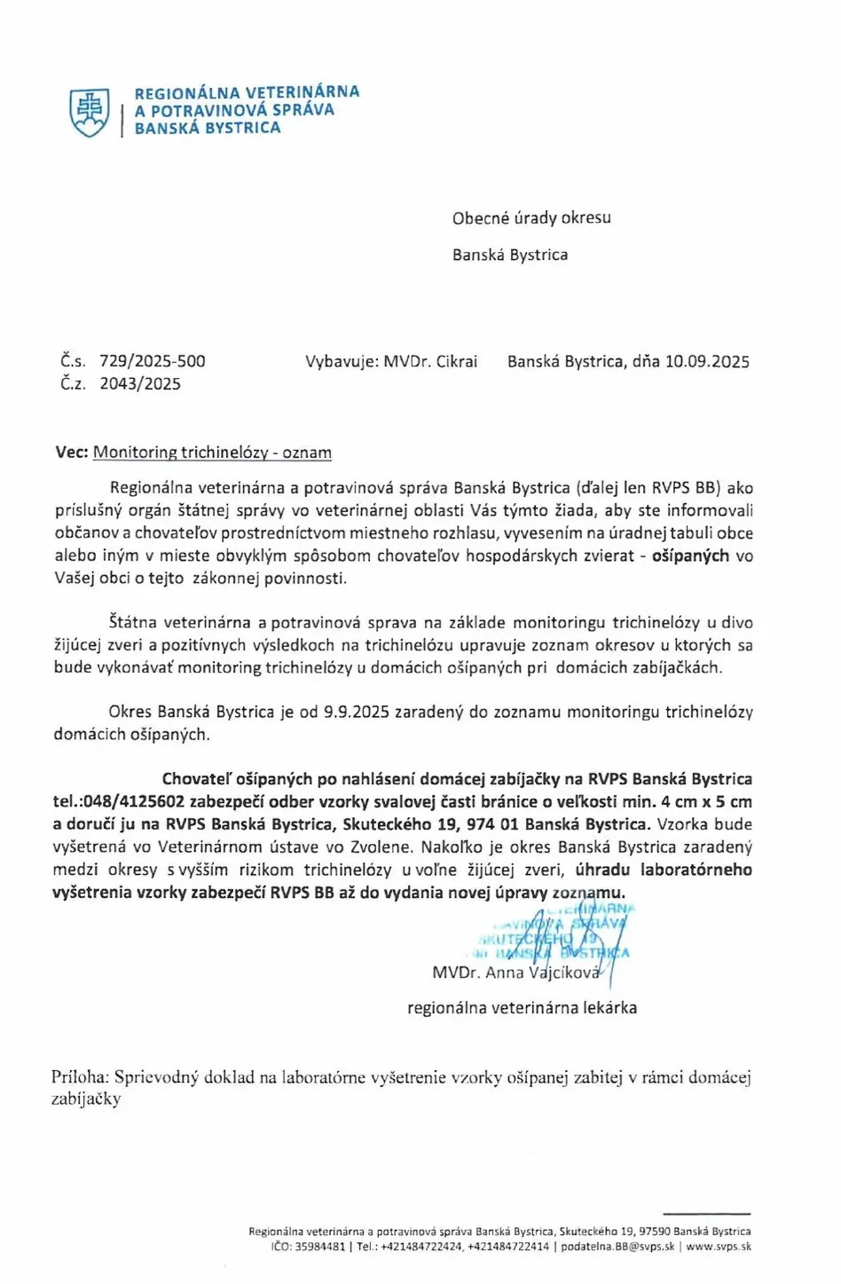 Regionálna veterinárna a potravinová správa Banská Bystrica informuje občanov a chovateľov, že okres Banská Bystrica bol od 9. 9. 2025 zaradený do zoznamu monitoringu trichinelózy u domácich ošípaných pri domácich zabíjačkách.